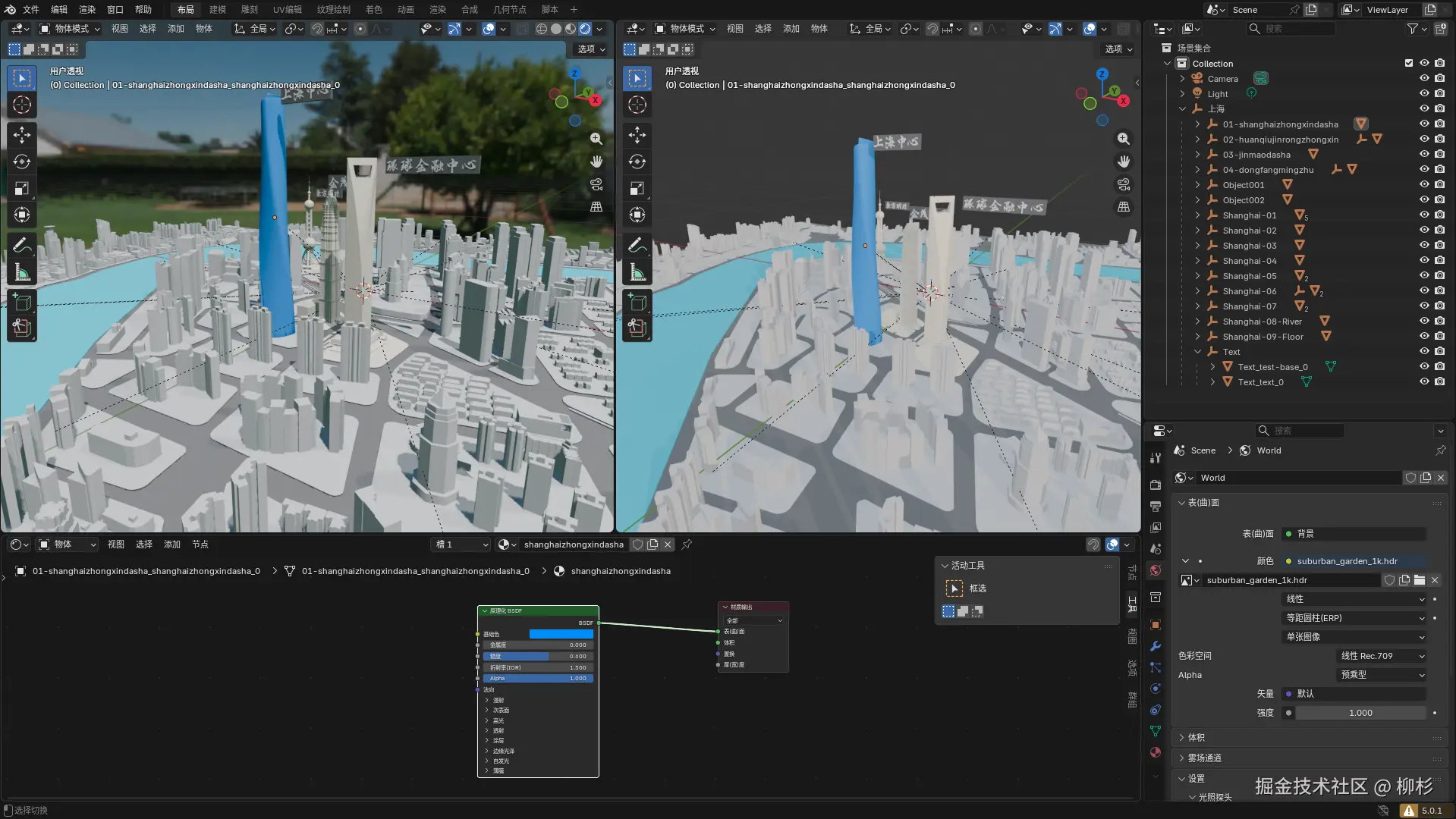 大屏中间那些上海城市的三维场景,靠切图根本没法用。切出来也就是张静态图片,放代码里死的。我在网上找到了相关的城市模型,我尝试了使用blender加载,要做到设计稿图中的效果,发现还是不简单的。