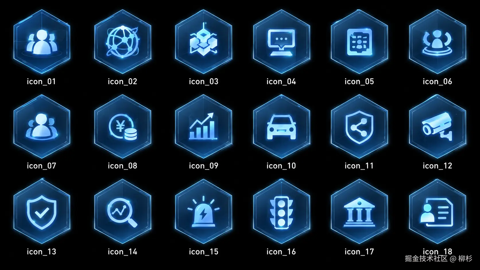 每个图标都是深色底的 PNG,尺寸统一调整到符合标准,边缘干净,发光效果完整保留。打开文件就能直接看到图标在深色背景上的实际效果,不用脑补。