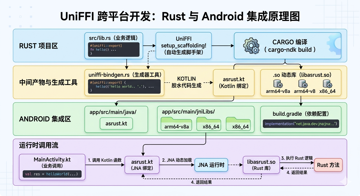 本文将指导你如何使用 UniFFI 自动化生成 Rust 与 Kotlin 的胶水层代码,省去繁琐的手写 JNI 过程。