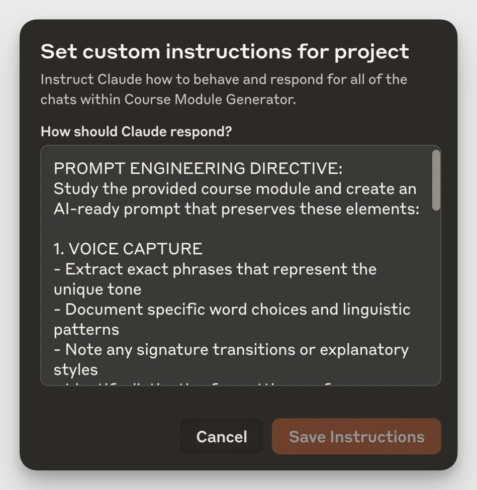 如果你使用 Claude Projects 功能,务必填写 Project Instructions 字段。建议为每个常用的工作流创建独立项目,将上下文信息通过语音录入 Google Doc 后导出为 PDF 上传,作为每个项目的知识基础。