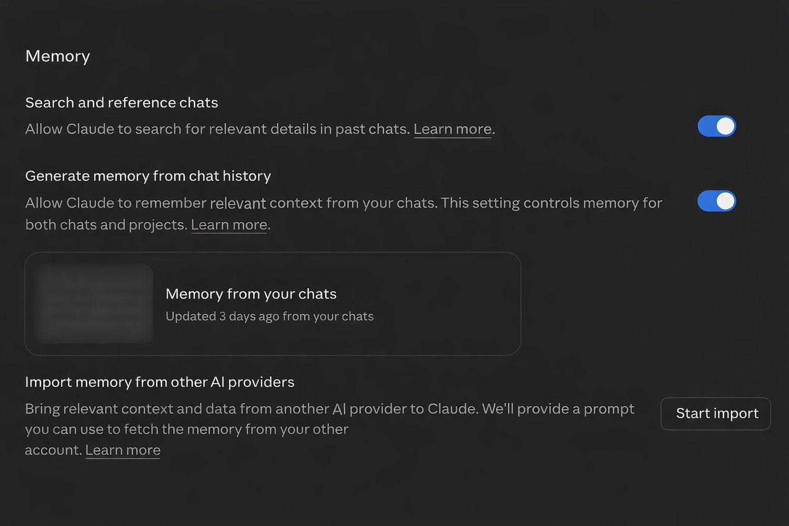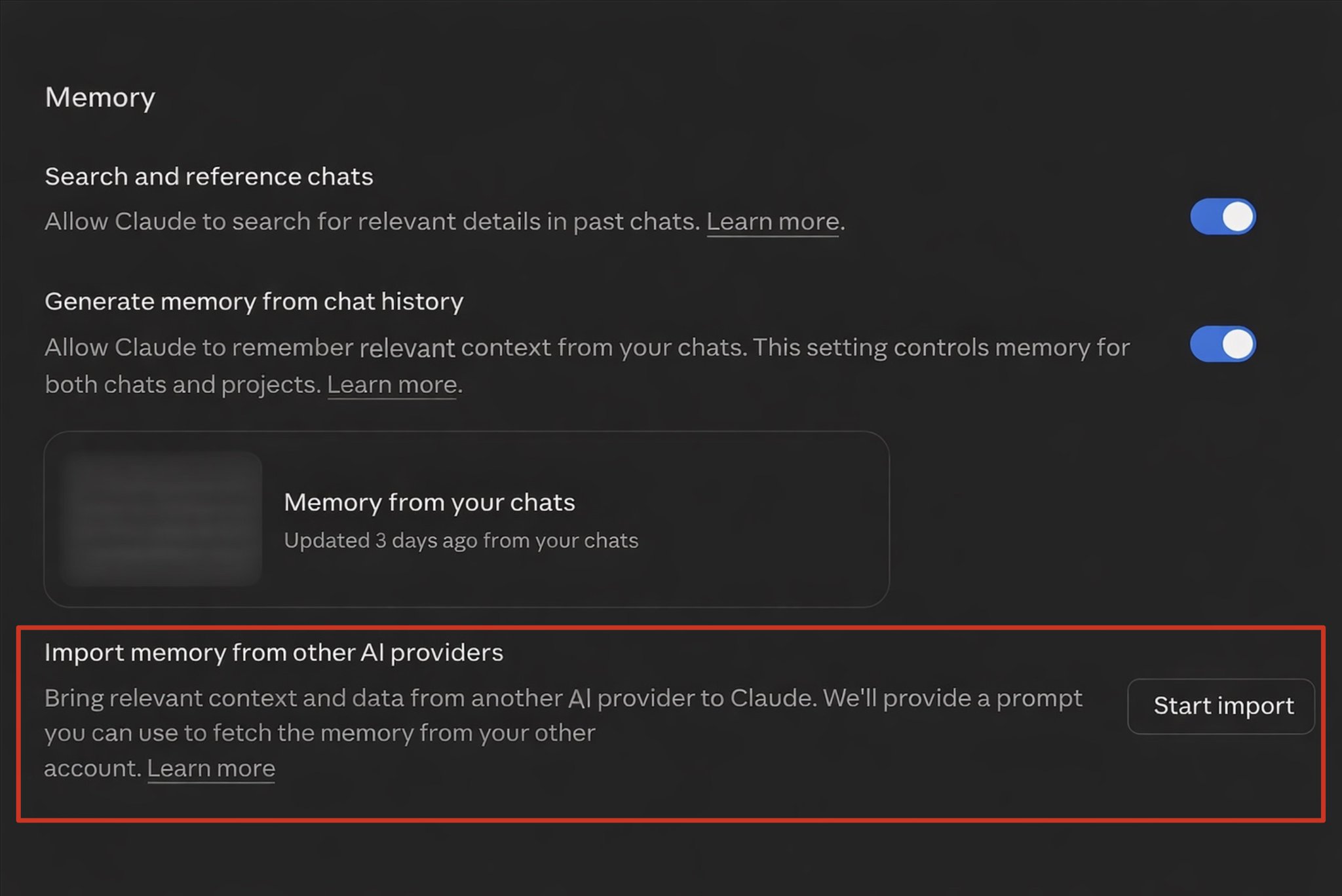 - 方式二:在 Claude 的 Settings → Memory 中使用 Import/Export 功能,直接导入其他 LLM 的数据