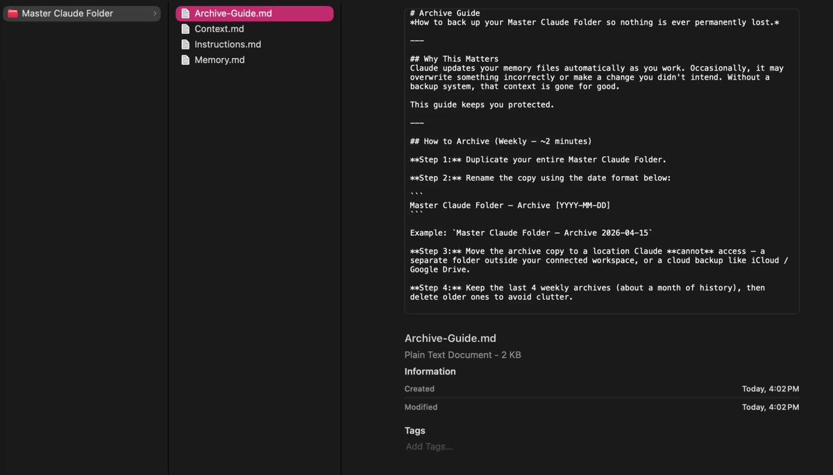 纯保护性措施。Claude 会在工作中自动更新记忆文件,偶尔会出现错误覆盖或非预期修改。修复方案很简单:每周将整个 Master Folder 复制到一个 Claude 无法访问的独立归档文件夹,标注日期。一旦出现问题,可以从归档中恢复。