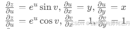 ∂ z ∂ x = ∂ z ∂ u ∂ u ∂ x + ∂ z ∂ v ∂ v ∂ x \frac{\partial z}{\partial x}=\frac{\partial z}{\partial u}\frac{\partial u}{\partial x}+\frac{\partial z}{\partial v}\frac{\partial v}{\partial x} ∂x∂z=∂u∂z∂x∂u+∂v∂z∂x∂v