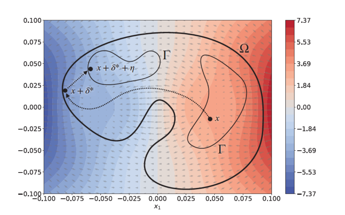 - **投影类比:**攻击者首先在对象x的特征空间中进行基于梯度的攻击,从而得到一个特征向量 $$x+δ$$,该特征向量被分类为负数,具有很高的可信度。然而,这一点不在约束条件Γ的可行性空间中,后者比Ω的约束条件更为严格。因此,攻击者需要找到一个投影,将$$ x+δ^*$$ 映射回可行的问题空间区域,从而增加副作用特征向量 $$η$$.