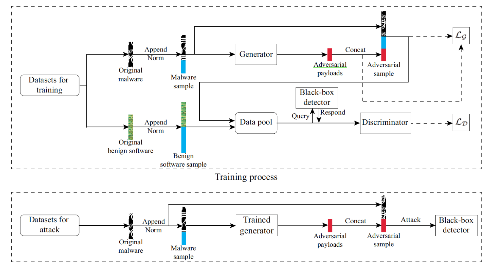 - 在我们的模型中,一旦GANs的训练过程完成,生成器就可以在很短的时间内用输入的恶意软件二进制文件独立生成恶意软件对抗样本。