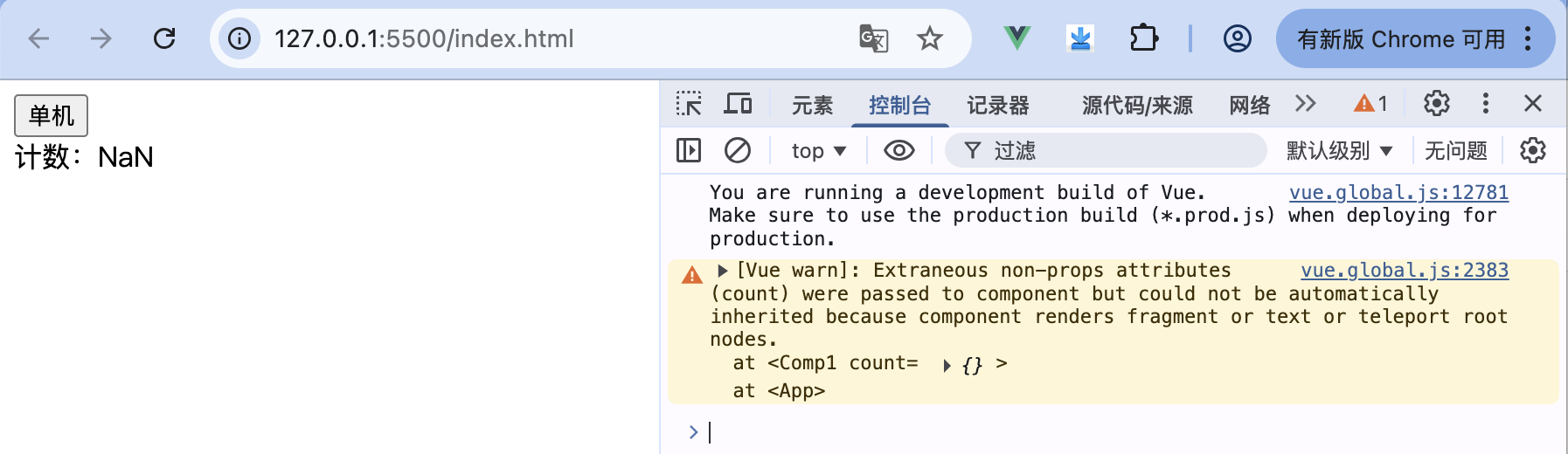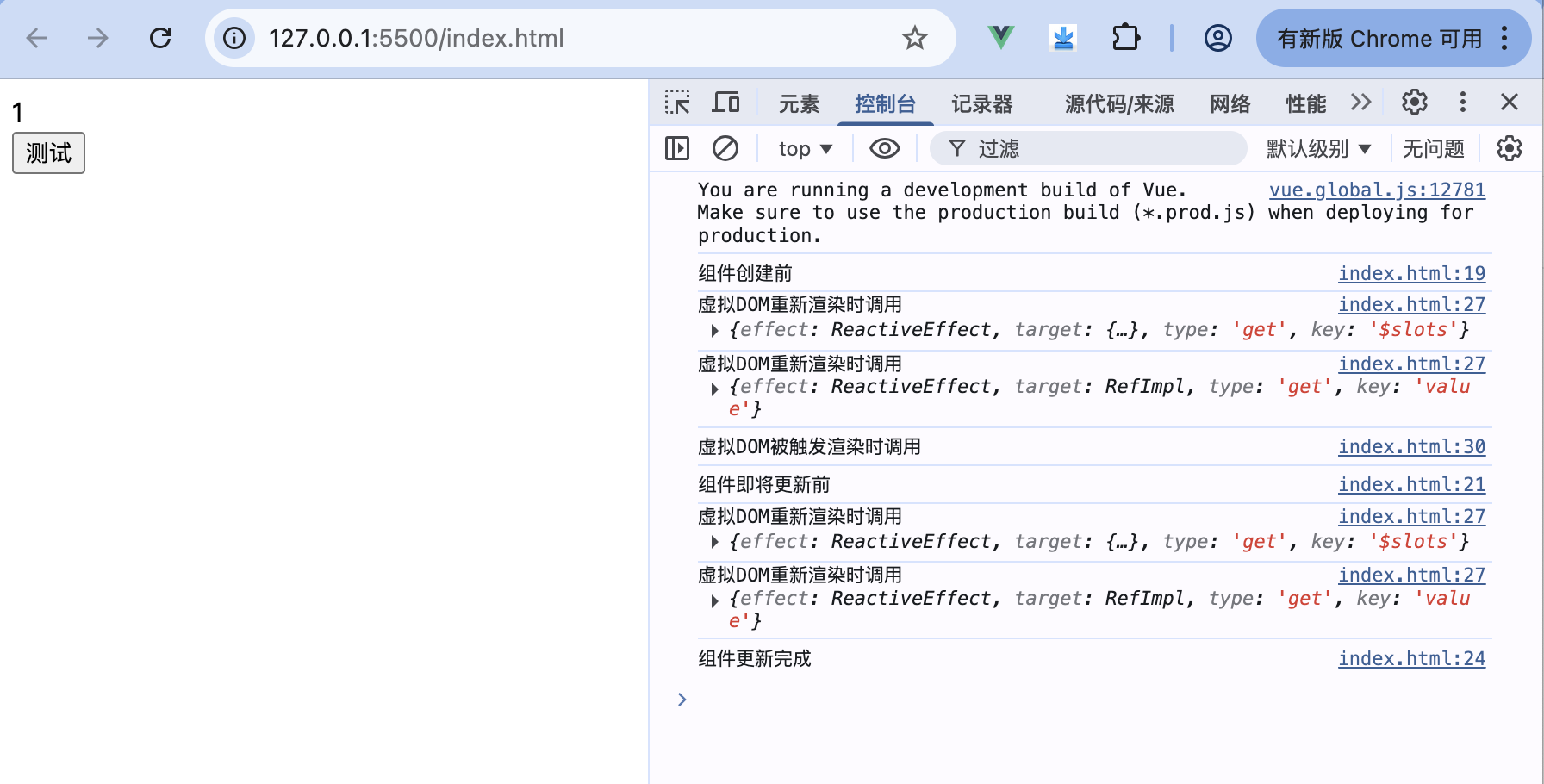 运行上述代码,当单击页面中的按钮时,页面显示的计数会自增,同时,控制台打印的信息如下: