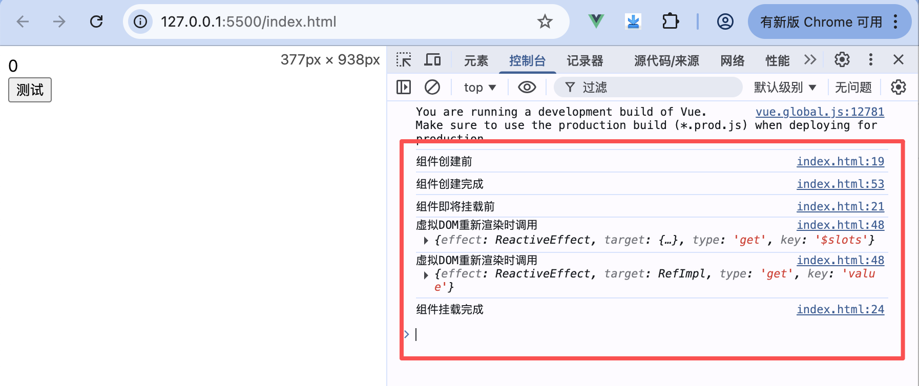 在上面列举的生命周期方法中,有4个方法经常使用,分别是renderTriggered、renderTracked、beforeUpdate和updated方法。当组件中的HTML元素发生渲染或更新时,会调用这些方法,例如: