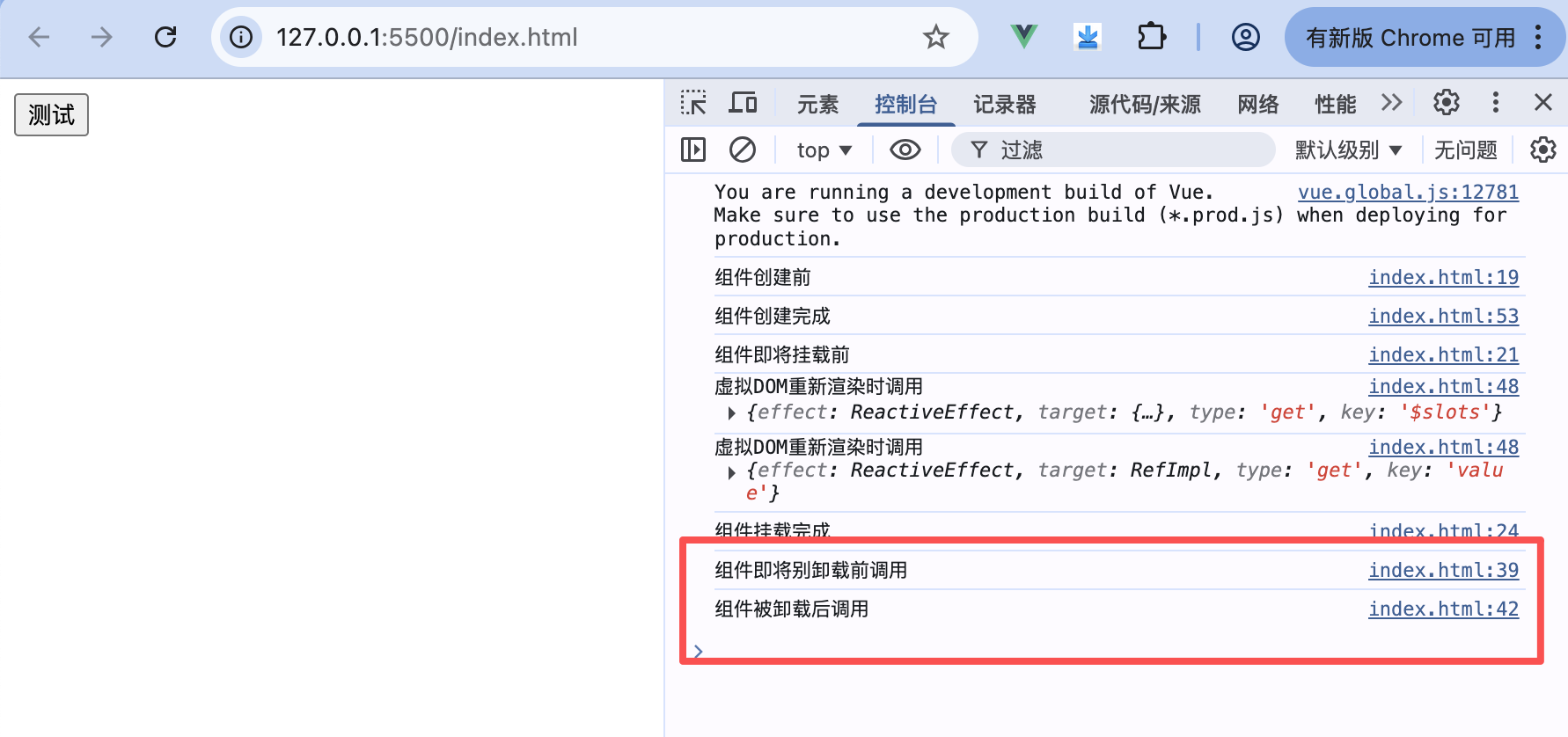 从控制台打印的信息可以看出,本次页面渲染过程中只执行了6个组件的生命周期方法,我们使用了一个自定义的组件,在页面渲染的过程中只执行了组件的创建和挂载过程,但是并没有执行卸载的过程。在代码中,我们使用v-if指令来控制子组件的渲染,当渲染状态切换时,组件会相应地进行挂载和卸载操作。你可以尝试单击页面中的按钮,当子组件显示和隐藏时,对应的挂载和卸载生命周期方法会被调用。