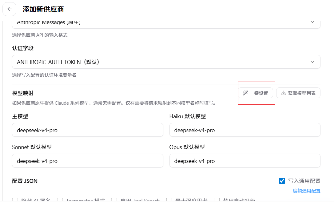 12.在模型映射,将主模型改为deepseek-v4-pro或者deepseek-v4-flash,并且点一键设置。配置完点击添加即可。