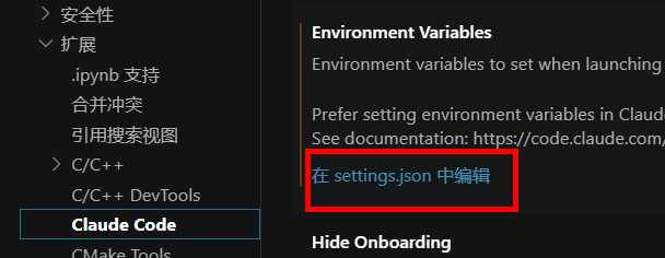 3.点击ctrl+, 用这个调出设置----扩展----claude code----在settings.json中编辑---claudeCode.environmentVariables内添加代码: