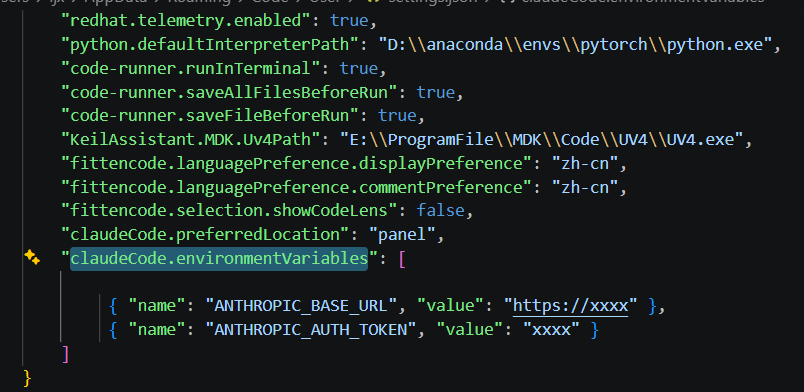 { "name": "ANTHROPIC_AUTH_TOKEN", "value": "xxxx" }