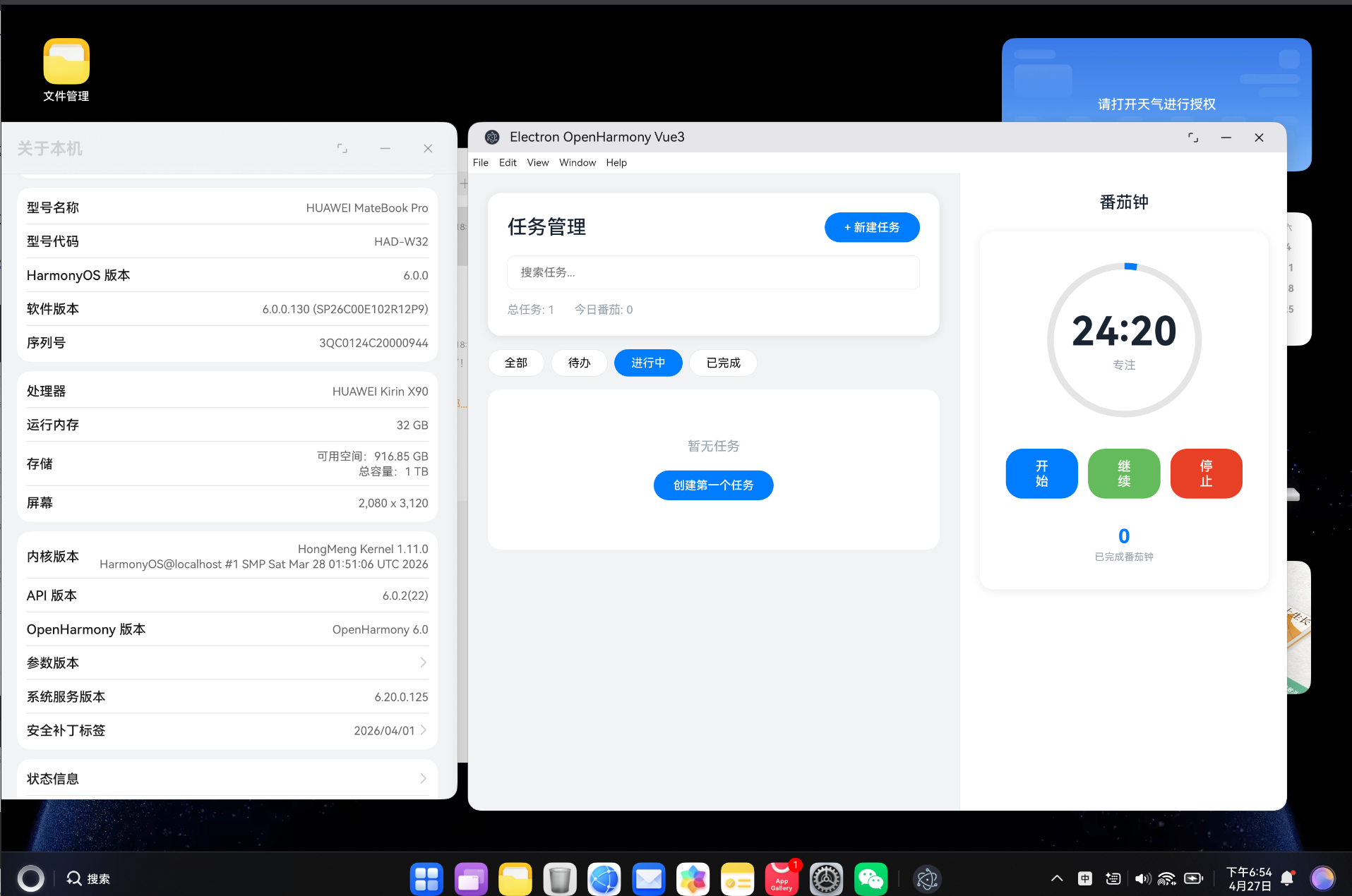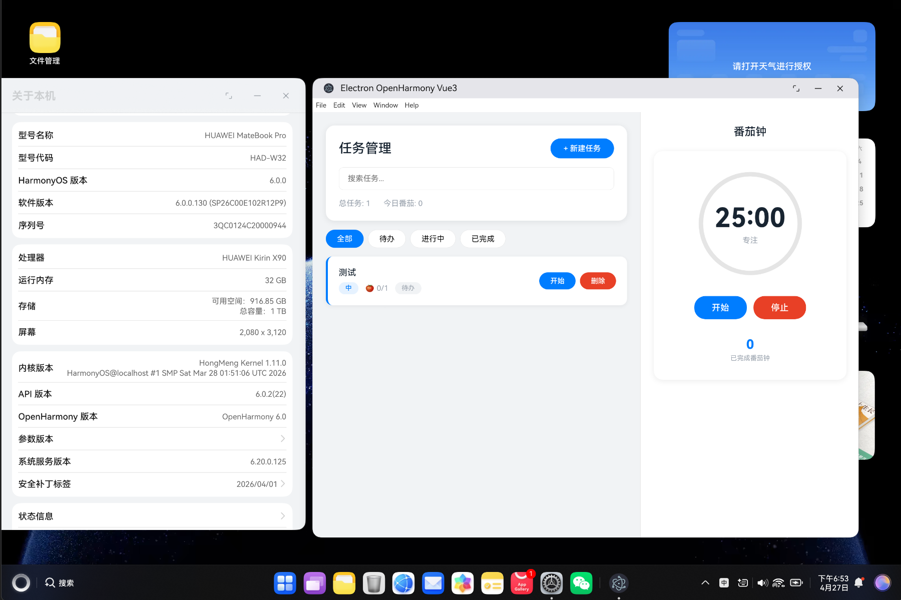本项目基于现有的 Electron-OpenHarmony-Vue3 架构,开发一款集任务管理、番茄钟、工作流管理于一体的效率工具,核心目标包括: