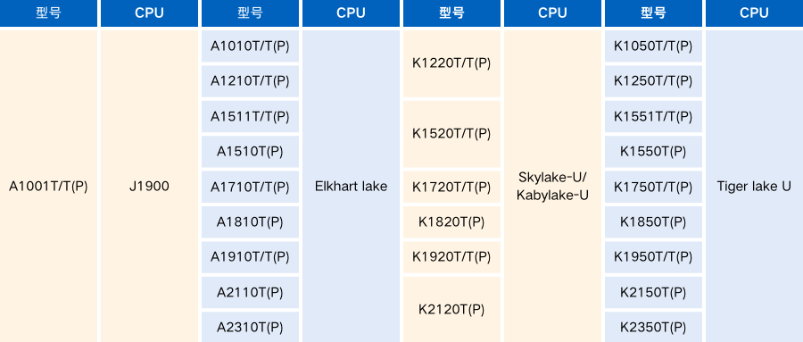 搭载Intel® Tiger lake U、Intel® Skylake-U/Kabylake-U、Intel® Elkhart lake,Intel Baytrail 系列处理器,满足不同性能需求。其中Intel® Tigerlake U平台,采用ULT SoC设计,TDP仅15W,兼顾高性能与低功耗。
