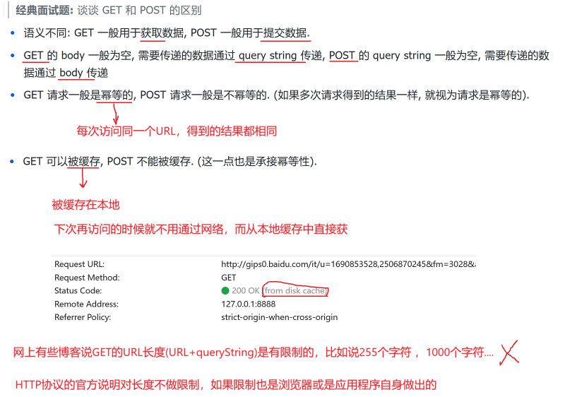 GET 是安全的、幂等的: 这意味着你仅仅是去"看"一眼数据,无论你看一次还是看一万次,服务器上的数据都不会因此改变。这也是为什么浏览器允许你随意刷新 GET 请求的页面。