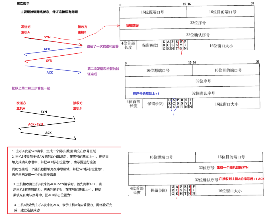 主机A接收到主机B发来的ACK+SYN请求时,首先判断ACK,表示主机B有应答能力,再去判断SYN,在序号的基础上+1,把结果填充在 确认序号中,把ACK标志位置为1