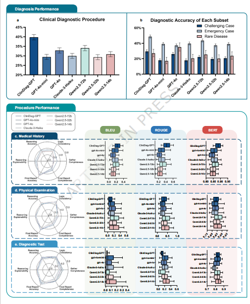 - 主实验对比:在动态临床诊断任务中,基于Qwen2.5-72B微调的ClinDiag-GPT取得了39.76%的诊断准确率,全面超越了GPT-4o、Claude-3等基线大模型。
