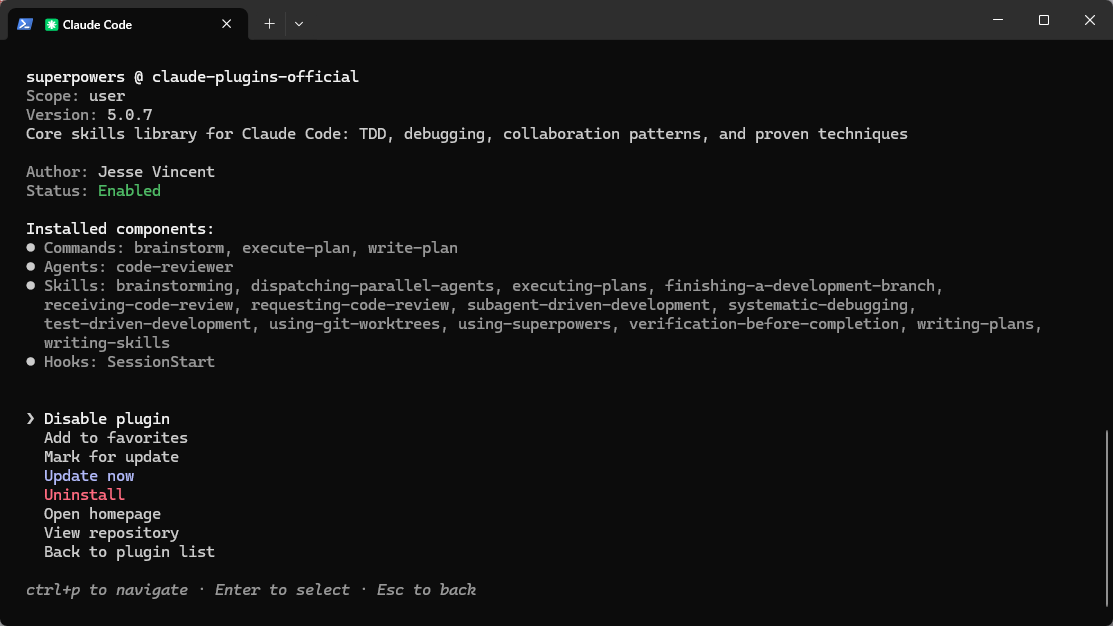 以下为superpowers插件所携带的组件,包括3个命令、1个agent、14个技能和1个hook函数。