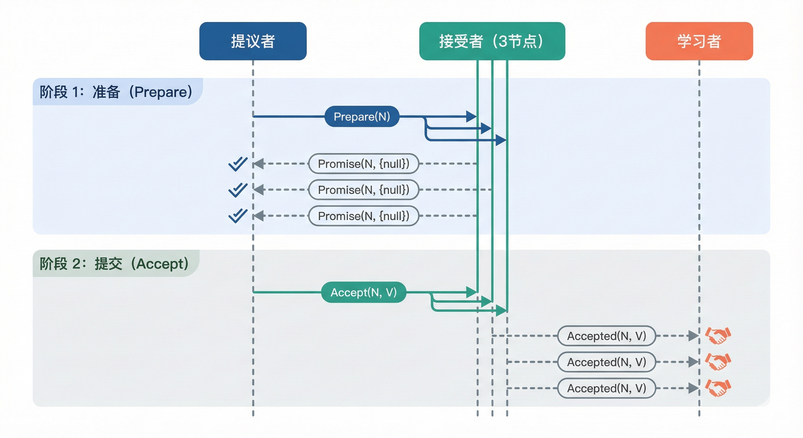 Paxos 是解决非拜占庭故障的标准算法。它通过两阶段提交(Prepare/Promise -> Accept/Accepted)来达成一致。