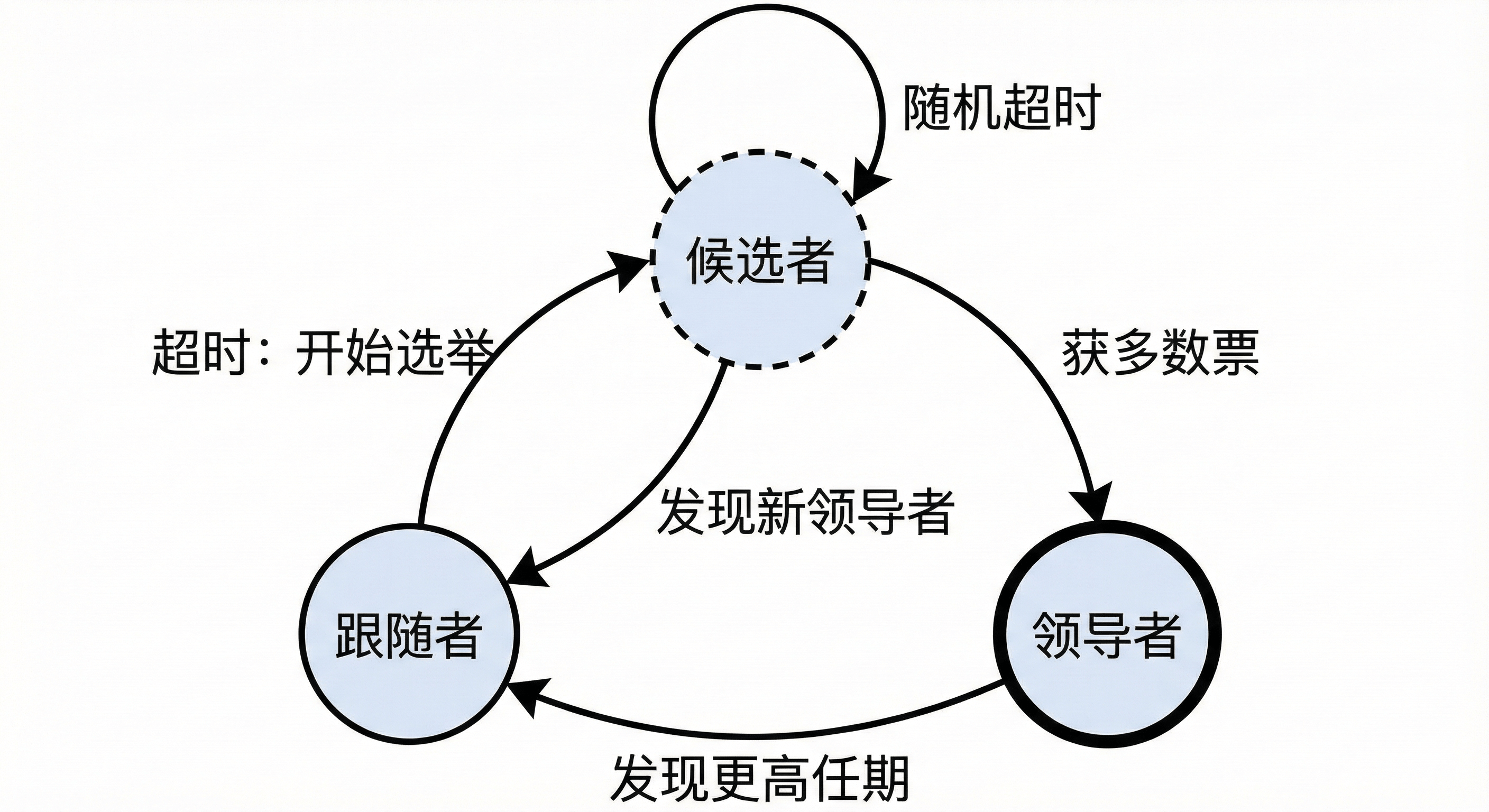 AppendEntries消息)。 - 如果 Follower 在选举超时时间(Election Timeout)内未收到心跳信号,则认为 Leader 已死,转为 Candidate 发起选举。