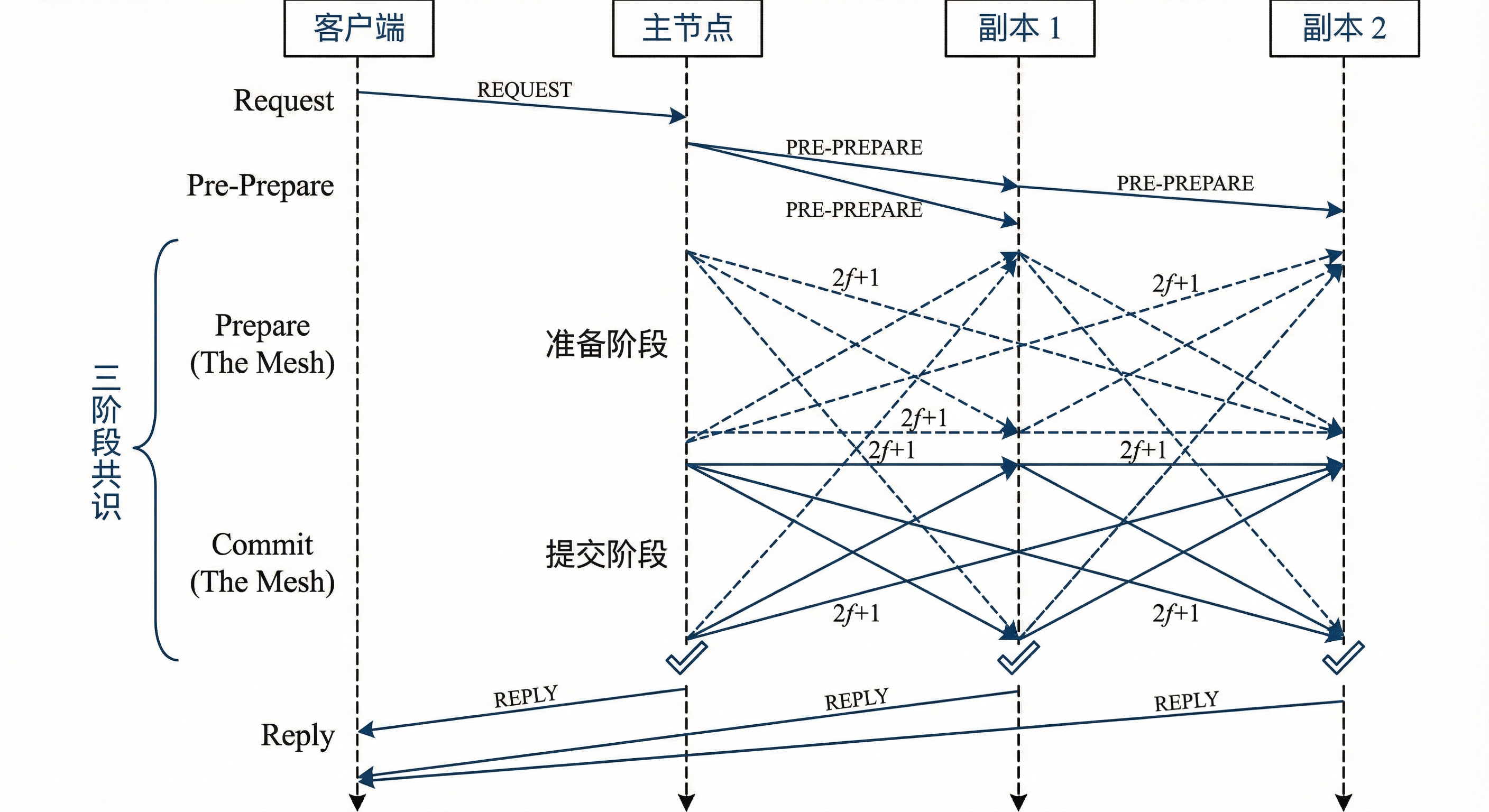 PBFT 通过 Pre-Prepare 、Prepare 、Commit 三个阶段的消息广播,确保在有恶意节点干扰的情况下,诚实节点仍能达成一致。其中 Prepare 和 Commit 阶段需要全网广播(All-to-All),通信复杂度较高。