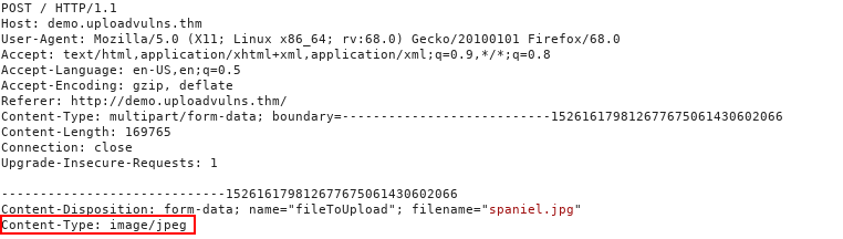 MIME类型遵循<type>/<subtype>格式。在上面的请求中,您可以看到图像"spaniel.jpg"已上传到服务器。作为合法的JPEG图像,此上传的MIME类型为"image/JPEG"。可以在客户端和/或服务器端检查文件的MIME类型;然而,由于MIME基于文件的扩展名,因此很容易绕过。