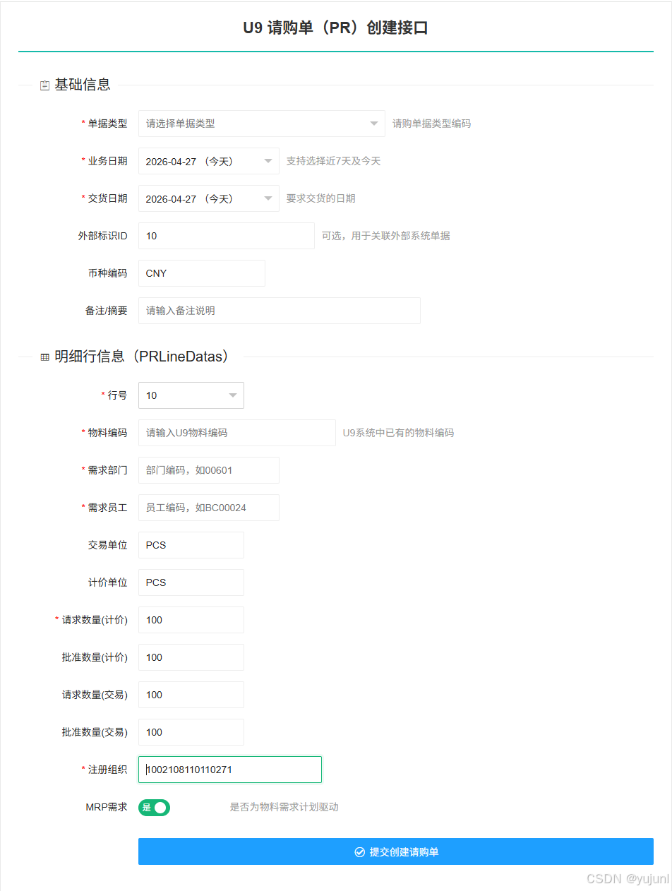 测试完成用友公司u9c的一个OpenAPI的demo。后台的业务逻辑验证成功,数据正常保存,前端也能正常显示出来。效果如下。