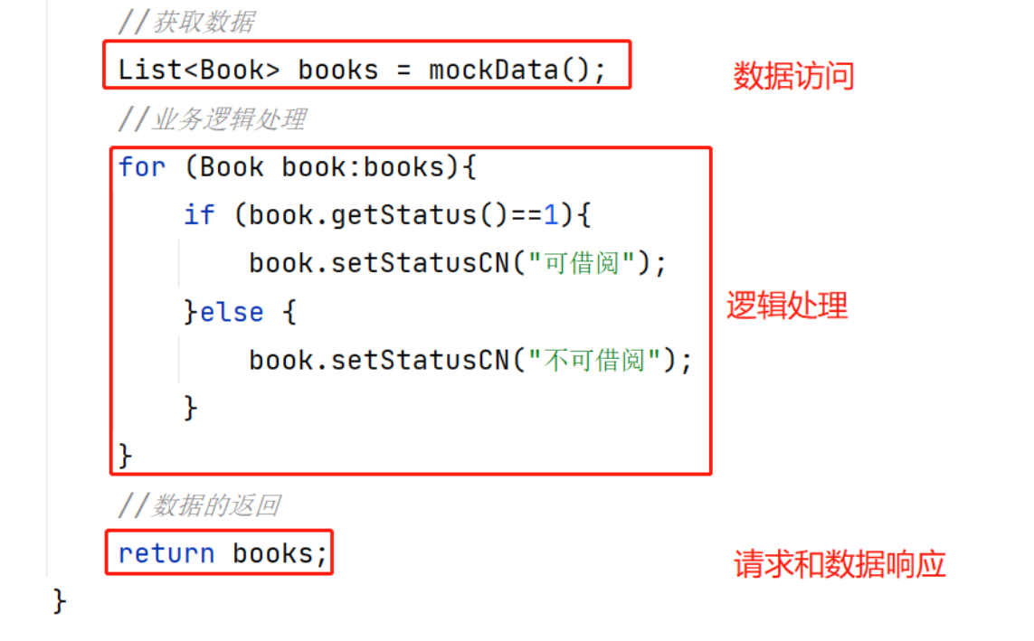 按照上面的层次划分, Spring MVC 站在后端开发人员的角度上, 也进行了支持, 把上面的代码划分为三个部分: