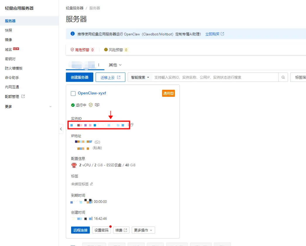 - 确认订单并支付,等待5-10分钟,实例状态变为「运行中」,复制服务器公网IP(后续访问必备)。