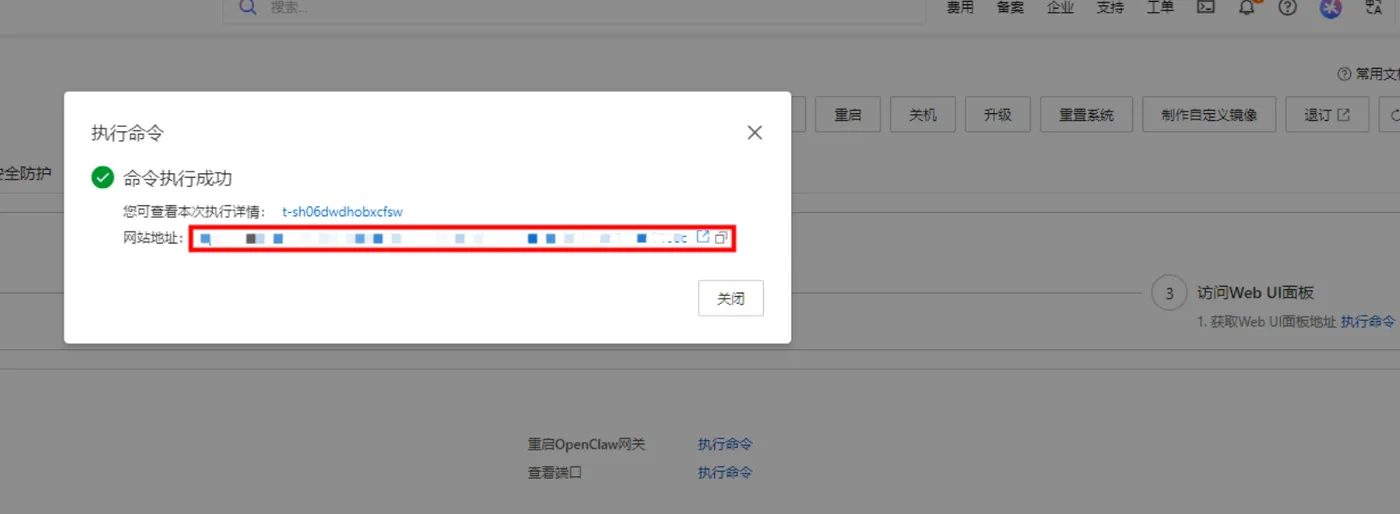 获取访问地址单击访问 Web UI 面板下的执行命令,获取 OpenClaw WebUI 的地址。