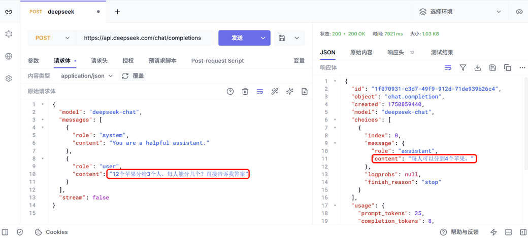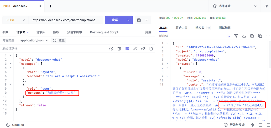 注意,这里请求参数中的messages是一个消息数组,而且其中的消息要包含两个属性: