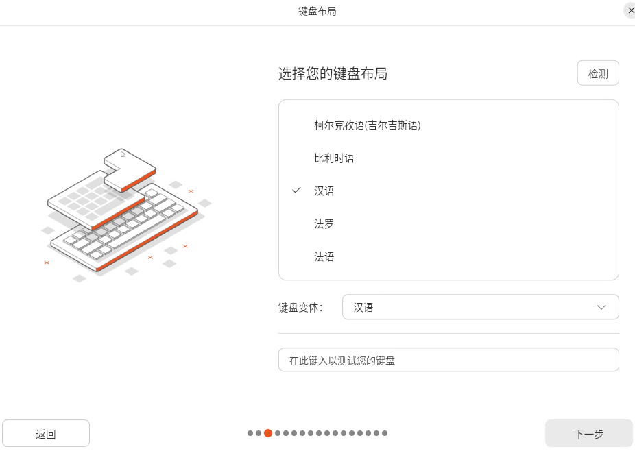 第3步,键盘布局,默认使用跟中文配套的【汉语】。