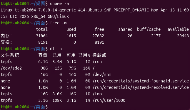 内核版本确实是最新的7.0.0版本,但是内存占用只有区区1615 MB,加上缓存也才占用不到4 GB,看来4 GB内存应该也能跑,官方推荐6 GB应该是为了保证流畅运行GNOME 50的各种特效。