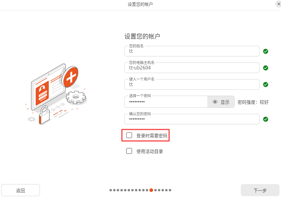 第11步,设置账户信息。注意这里的【登录时需要密码】,跟桌面共享相关的坑你还记得吗(原生支持真的好用吗?Ubuntu 24.04桌面共享vs远程登录全解析)?回头我们也再次测试一下。