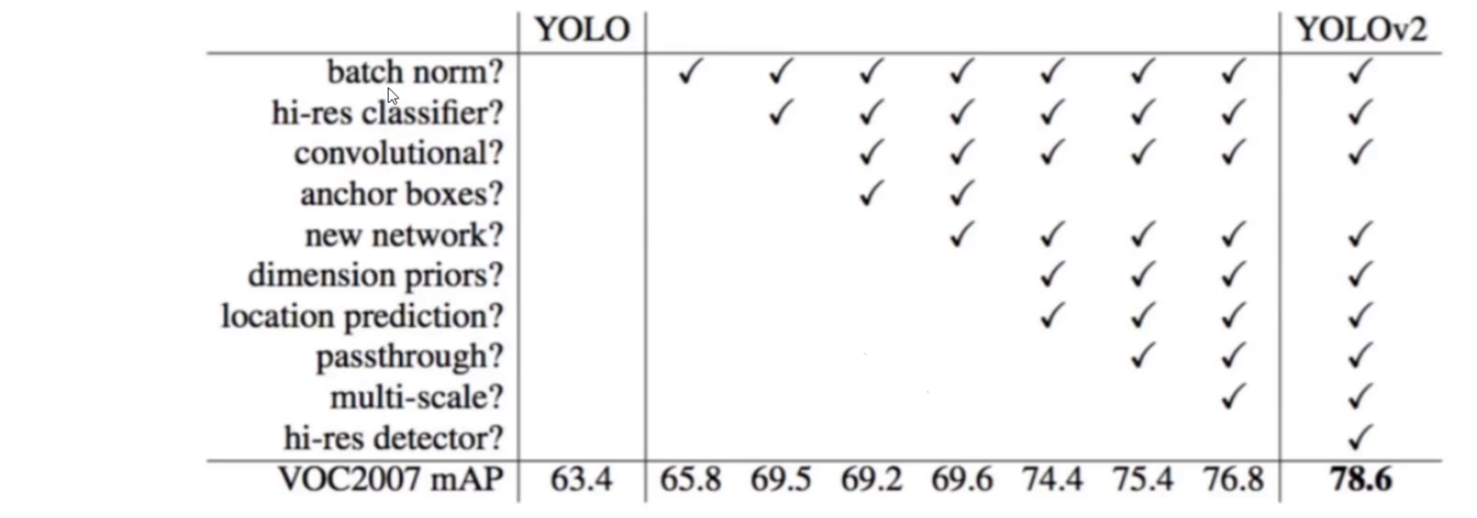 先通过表格直观感受 YOLOv2 各项优化对精度的贡献(基于 VOC2007 数据集):