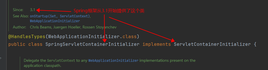 Spring3.1 版本针对该规范提供了适配实现,核心是WebApplicationInitializer接口,