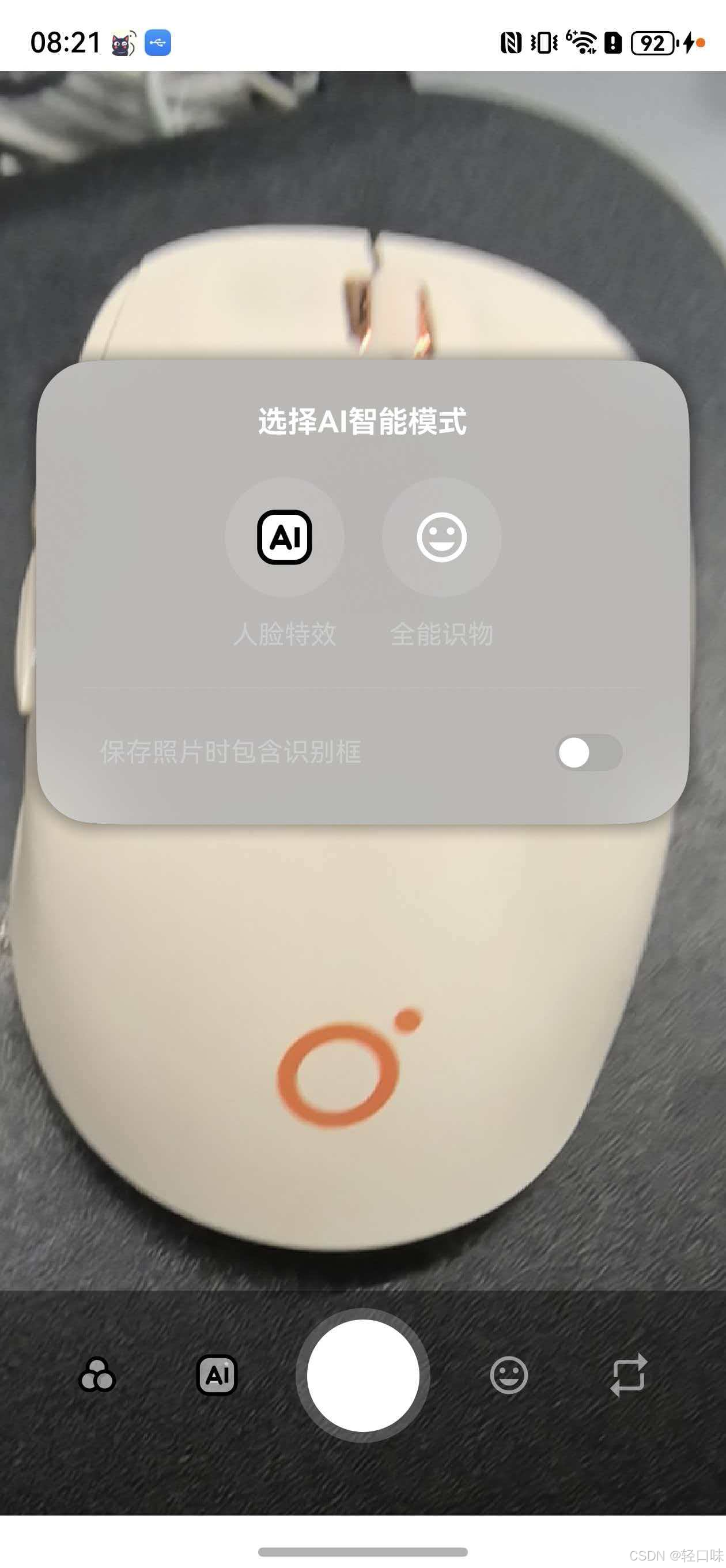 点击AI按钮出现选择AI智能模式后选择全物识别,当识别到物品时会通过框线标记出来: