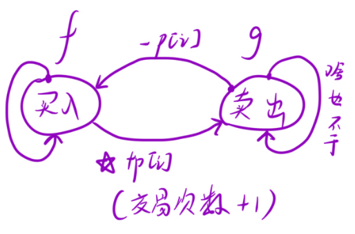 为了更加清晰的区分买入和卖出,我们换成有股票和无股票两个状态.
