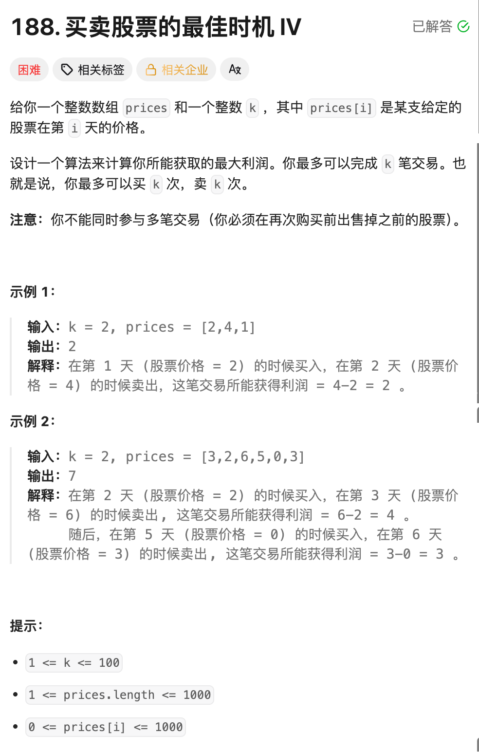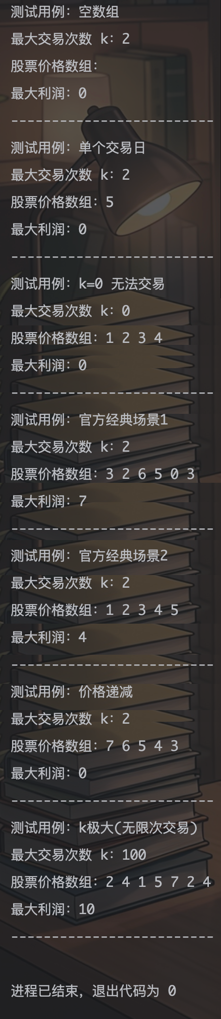 // 用例4:官方经典用例 k=2, [3,2,6,5,0,3] → 最大利润7