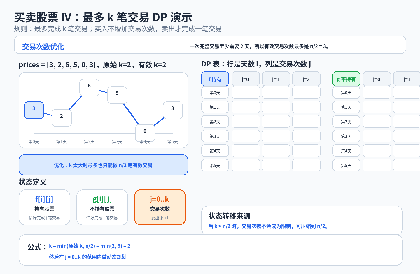 我们的交易次数是不会超过整个天数的一半的,因此我们可以先把 k 处理一下,优化一下问题的规模:k = min(k, n / 2)