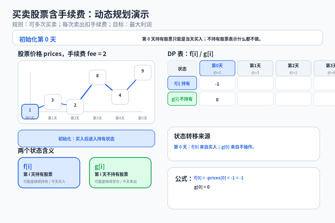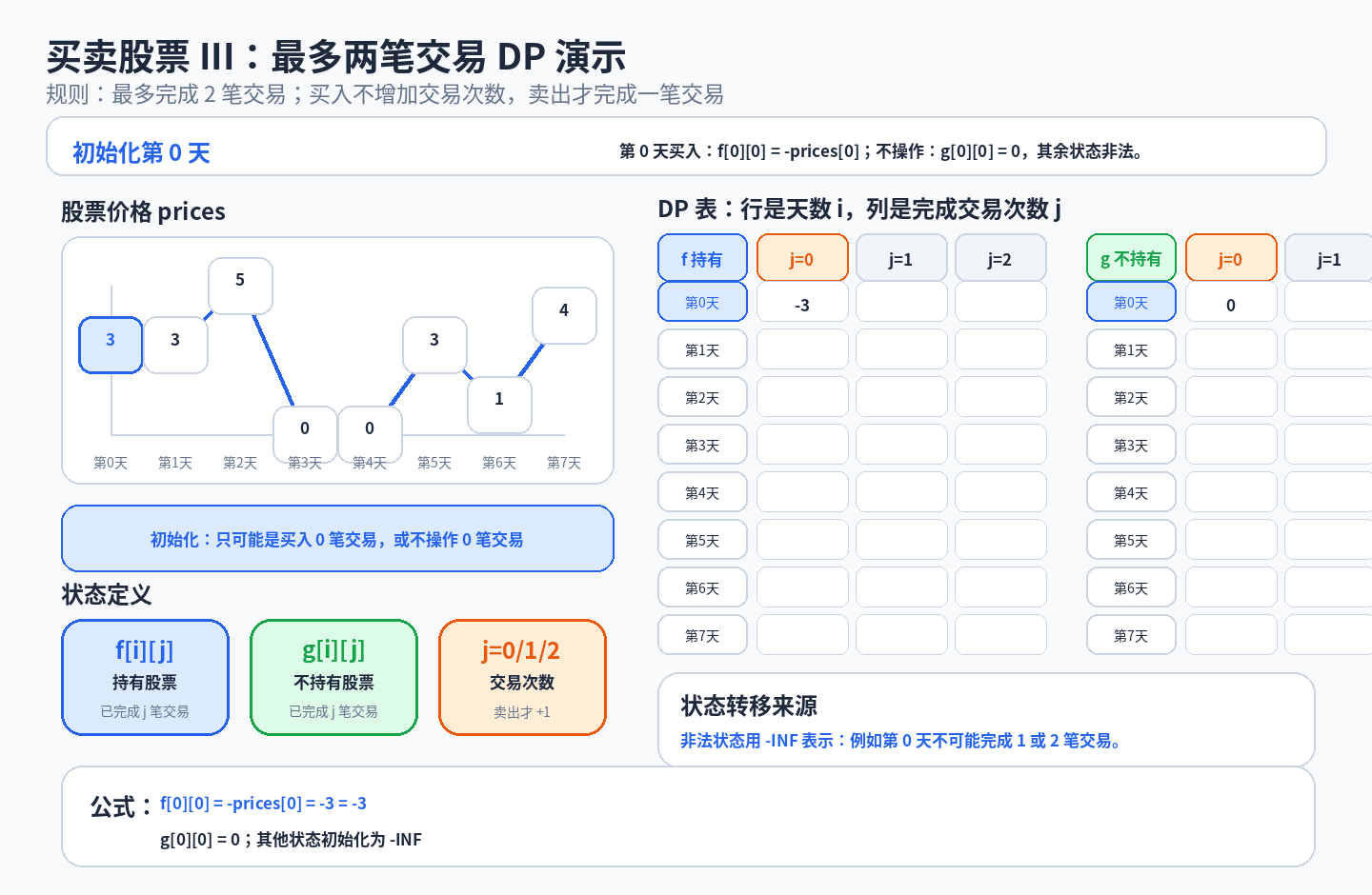 f[0][0] = -prices[0]; // 第0天买入股票,完成0笔交易,利润为 -股价
