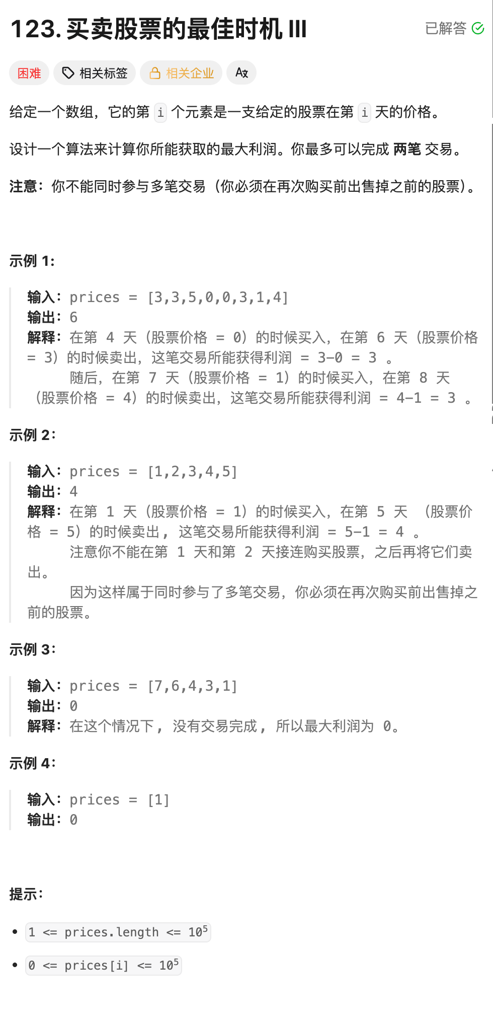 // 用例3:官方经典用例 [3,3,5,0,0,3,1,4] → 最大利润6