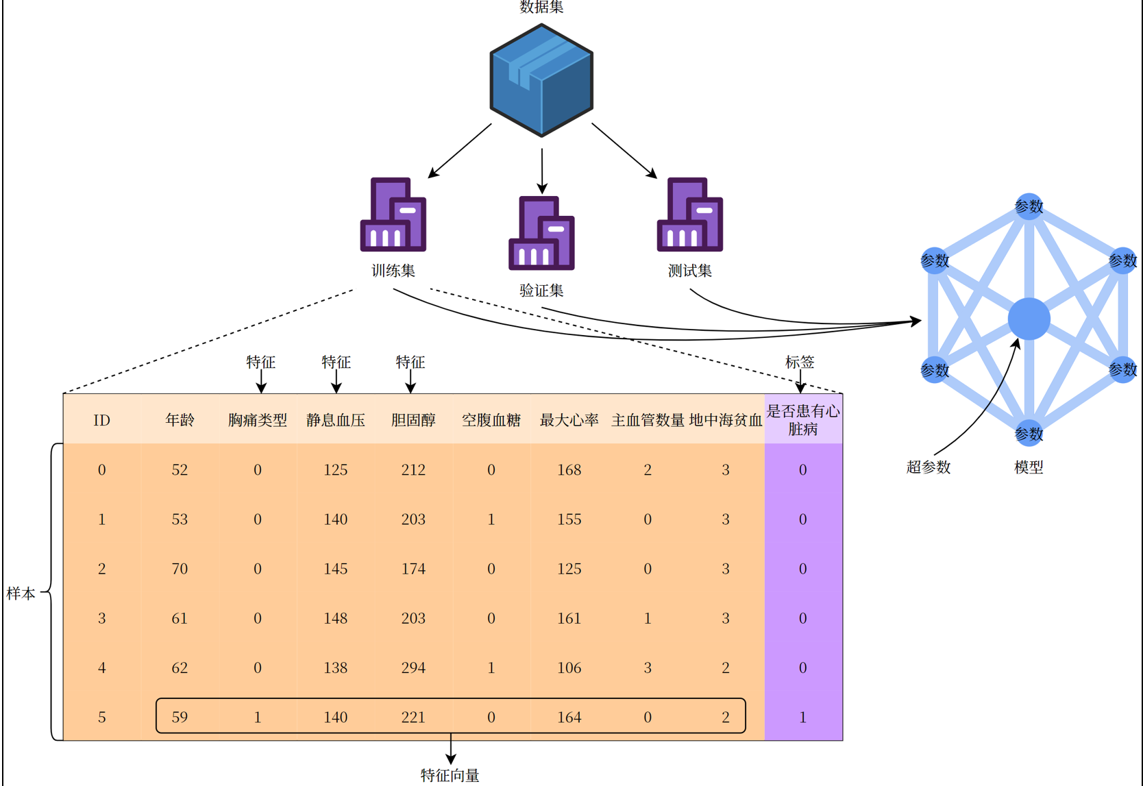 模型(Model):一个机器学习算法与训练后的参数集合,用于进行预测或分类。