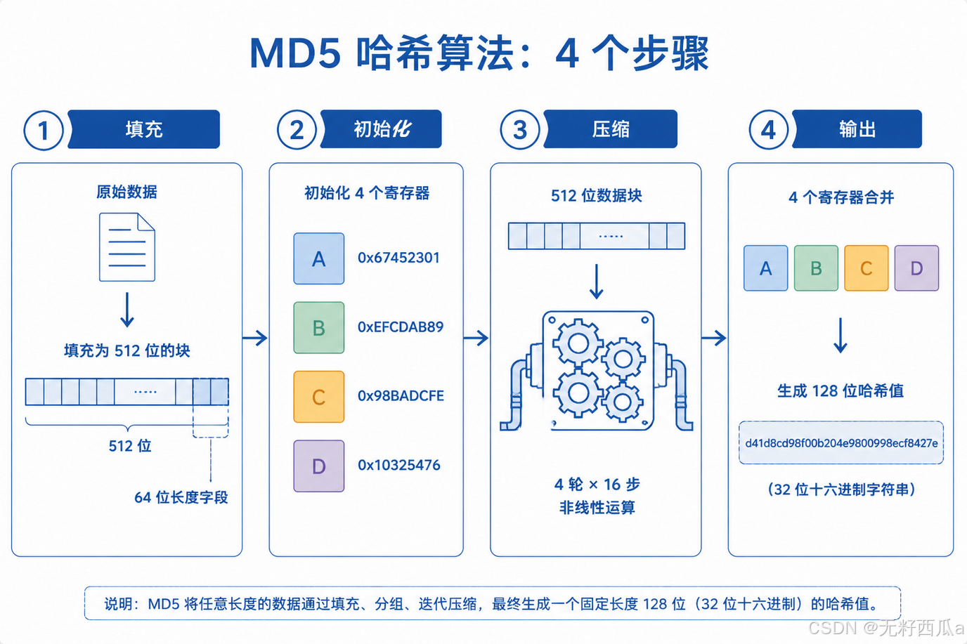 - 拼接输出 :把 4 个寄存器的最终值拼起来,得到 128 位的哈希值