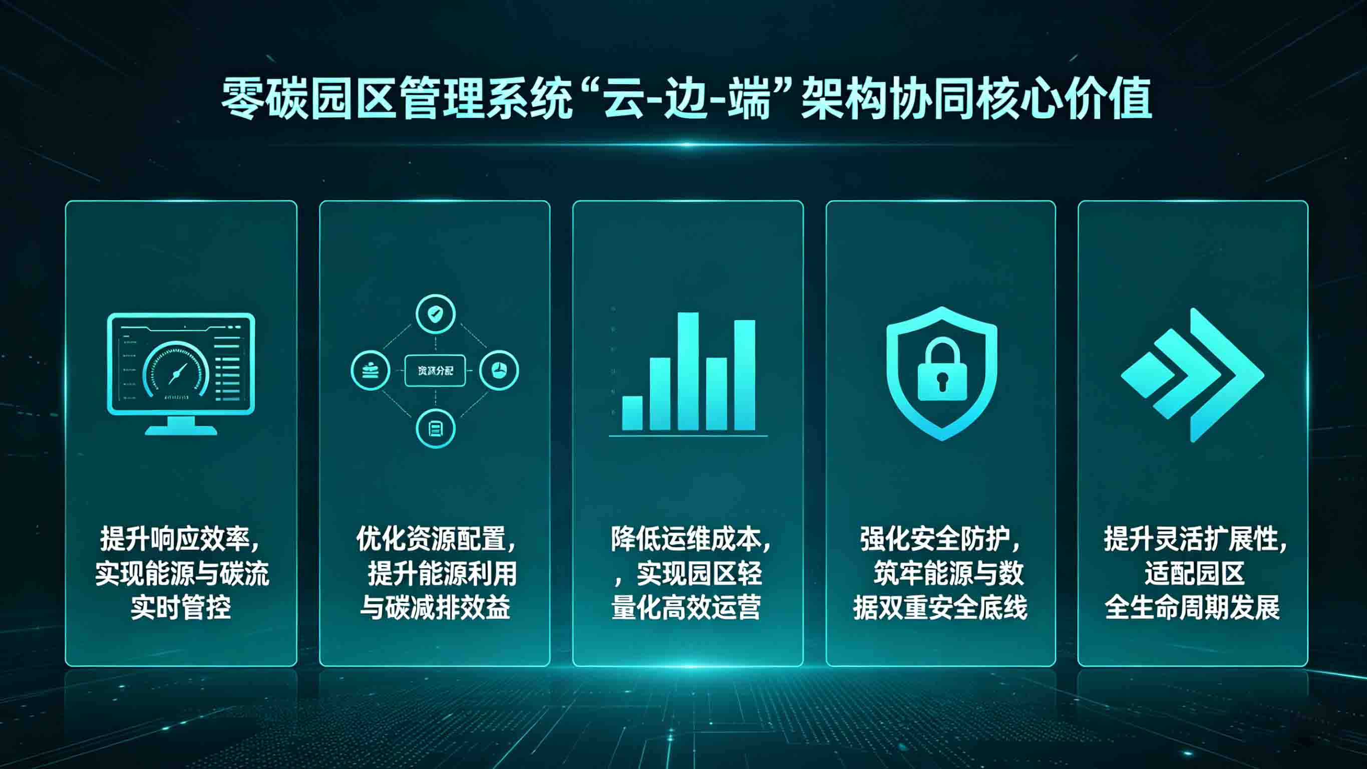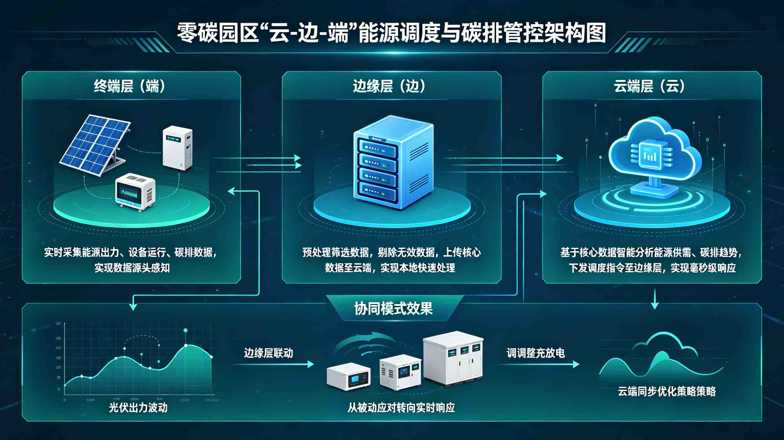 零碳园区的核心目标是实现能源高效利用与碳减排,"云-边-端"架构的协同的核心价值之一,就是通过资源统筹与智能调度,最大化提升新能源消纳率、降低能源浪费,推动碳减排目标落地。