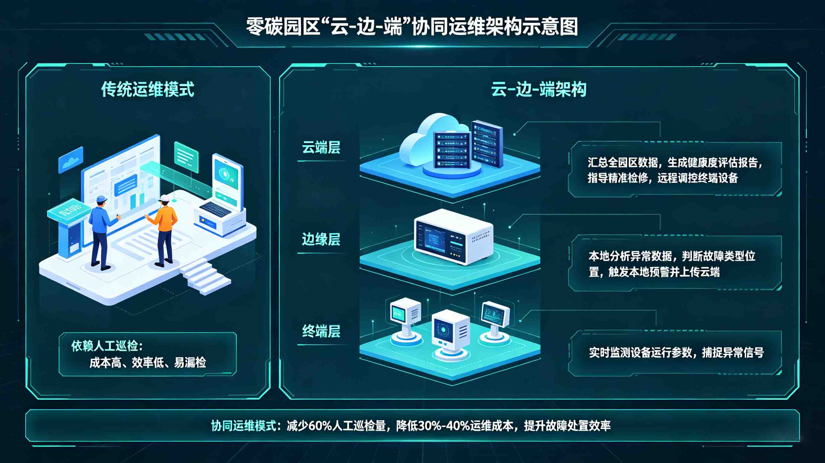 零碳园区设备种类繁杂、分布广泛,涵盖新能源发电、储能、碳监测等各类设备,传统运维模式依赖人工巡检,不仅成本高、效率低,还易出现故障漏检。"云-边-端"架构通过协同联动,实现运维模式的智能化、轻量化升级,大幅降低运维成本。