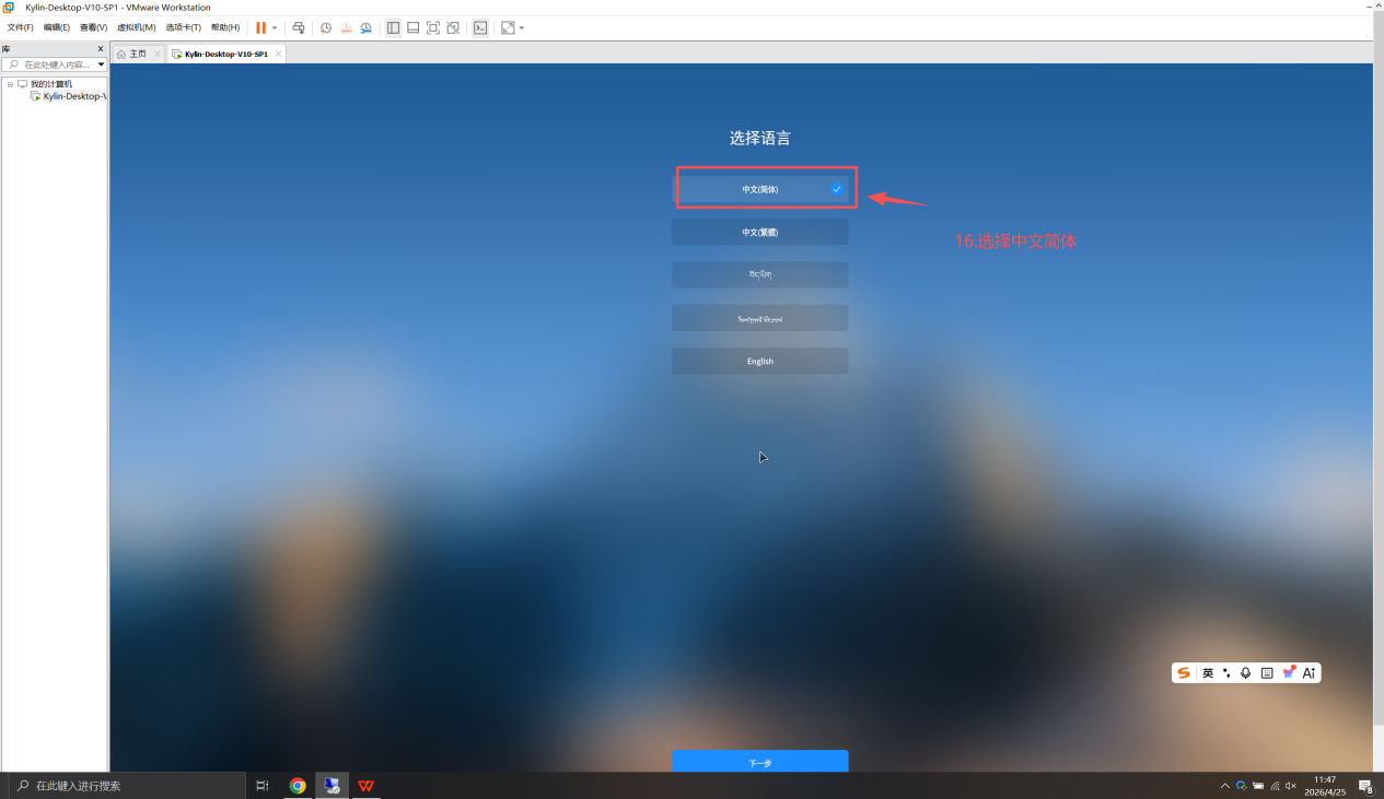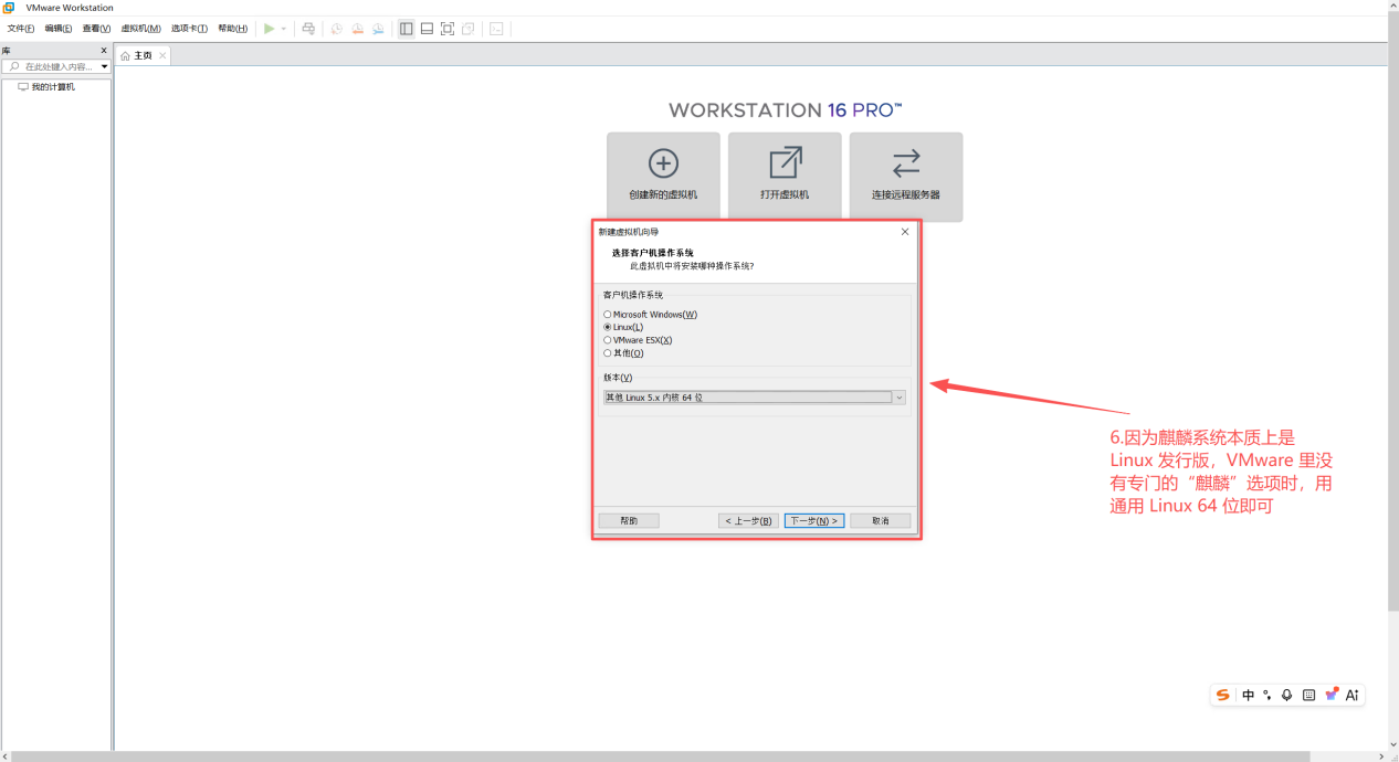 麒麟系统属于 Linux 发行版。VMware 未必能精确列出"麒麟"选项,可以选择