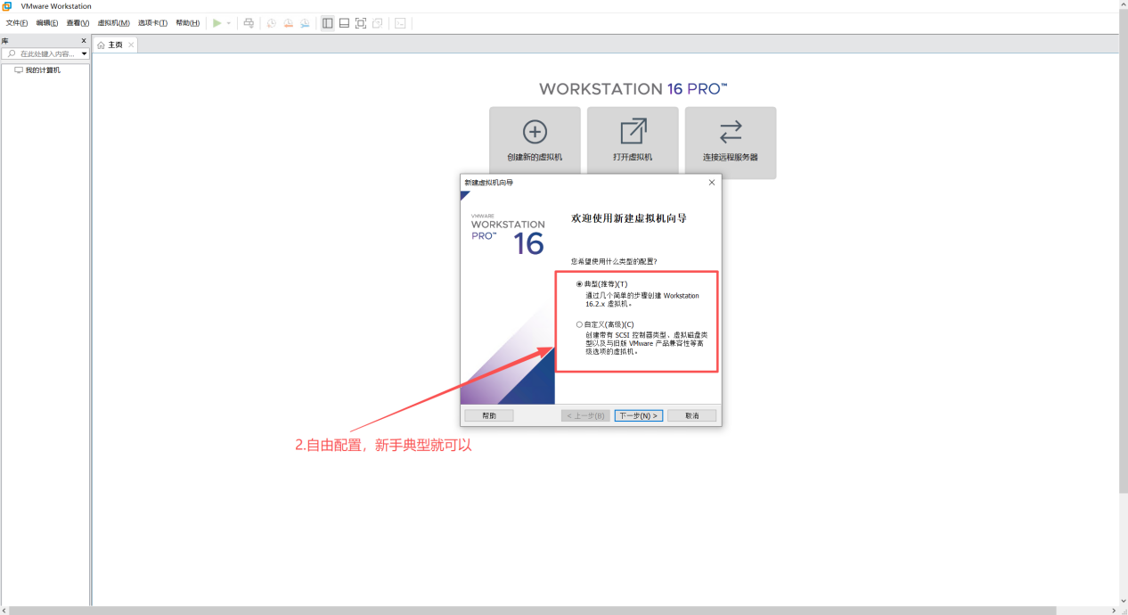 新手安装建议选择"典型(推荐)"。该模式会自动使用大多数默认配置,后续仍然可以进入"自定义硬件"调整内存、CPU、磁盘和光驱。