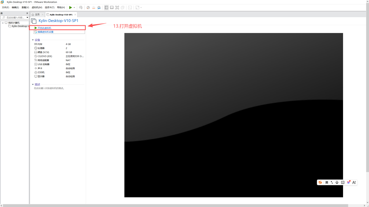 此时还没有真正安装麒麟系统,只是创建好了虚拟机外壳。