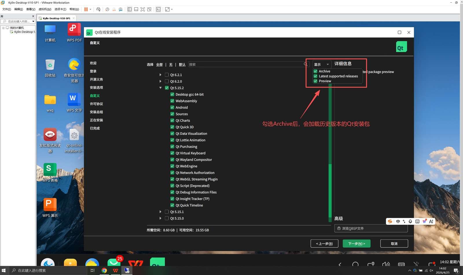 如果麒麟系统安装完成后需要继续安装 Qt 5.15.2,可参考本节。截图展示的是