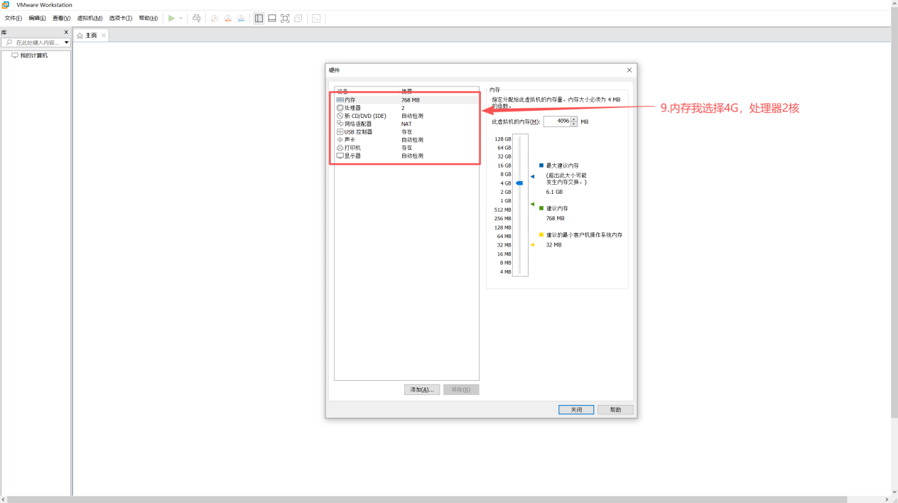 在硬件设置中根据主机性能调整虚拟机资源。截图示例为内存 4GB、处理器 2
